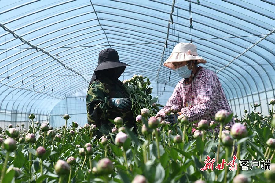 一大早,薄霧未散,走進蘭州新區(qū)秦川現(xiàn)代農(nóng)業(yè)產(chǎn)業(yè)園的智能溫控大棚內(nèi),采花工人兩人一組,手持剪刀,穿梭于芍藥叢中。