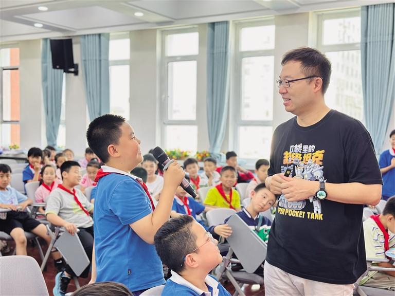 活動(dòng)當(dāng)天,“坦克叔叔”耿溧以生動(dòng)活潑、幽默風(fēng)趣的語(yǔ)言,向同學(xué)們分享了他的暢銷作品《口袋里的超級(jí)坦克》創(chuàng)作背后的故事。在互動(dòng)環(huán)節(jié),同學(xué)們積極踴躍地舉手提問,有的詢問關(guān)于坦克的相關(guān)知識(shí),有的請(qǐng)教寫作過程中遇到的問題,“坦克叔叔”都耐心地一一解答。現(xiàn)場(chǎng)氣氛熱烈非凡,同學(xué)們對(duì)知識(shí)的渴望和對(duì)閱讀的熱情被徹底點(diǎn)燃。